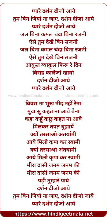 Lyrics of Pyare Darshan Dijo Aaye Tum Bin Jiyo Na Jaaye - प्यारे दर्शन दीजो आये तुम बिन जियो ना जाए