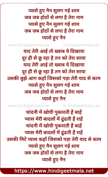 Lyrics of Pyase Huye Nain Sulag Gayi Sham, Jab Jab Hontho Se - प्यासे हुए नैन सुलग गई शाम,जब जब होठों से