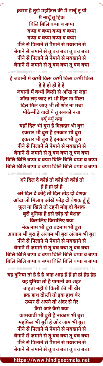 Lyrics of Qasam Hai Tujhe Mahafil Ki, Pine Se Pilaane Se - क़सम है तुझे महफ़िल की, पीने से पिलाने से