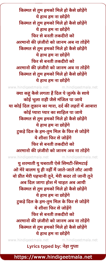 Lyrics of Qismat Se Tum Hamako Mile Ho Kaise Chhodenge - किस्मत से तुम हमको मिले हो कैसे छोड़ेंगे