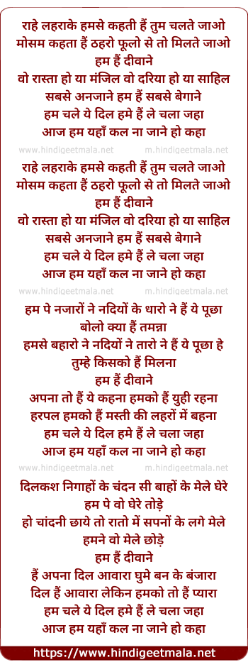 Lyrics of Raahe Lehrake Hamse Kehti Hai Tum Chale Jaao, Hum Hai Deewane - राहे लहराके हमसे कहती हैं तुम चलते जाओ, हम हैं दीवाने