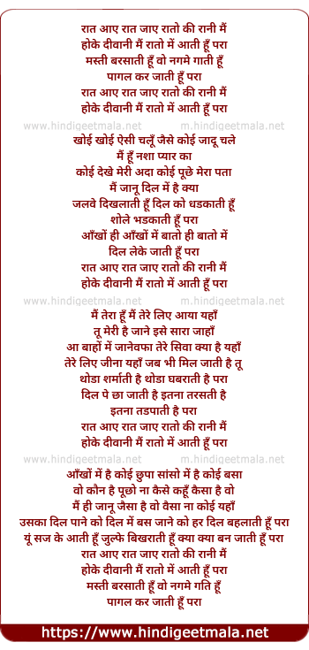 Lyrics of Raat Aaye Raat Jaaye, Raato Ki Rani Main - रात आए रात जाए, रातो की रानी मैं