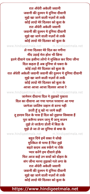 Lyrics of Raat Andheri Akeli Jawani - रात अँधेरी अकेली जवानी