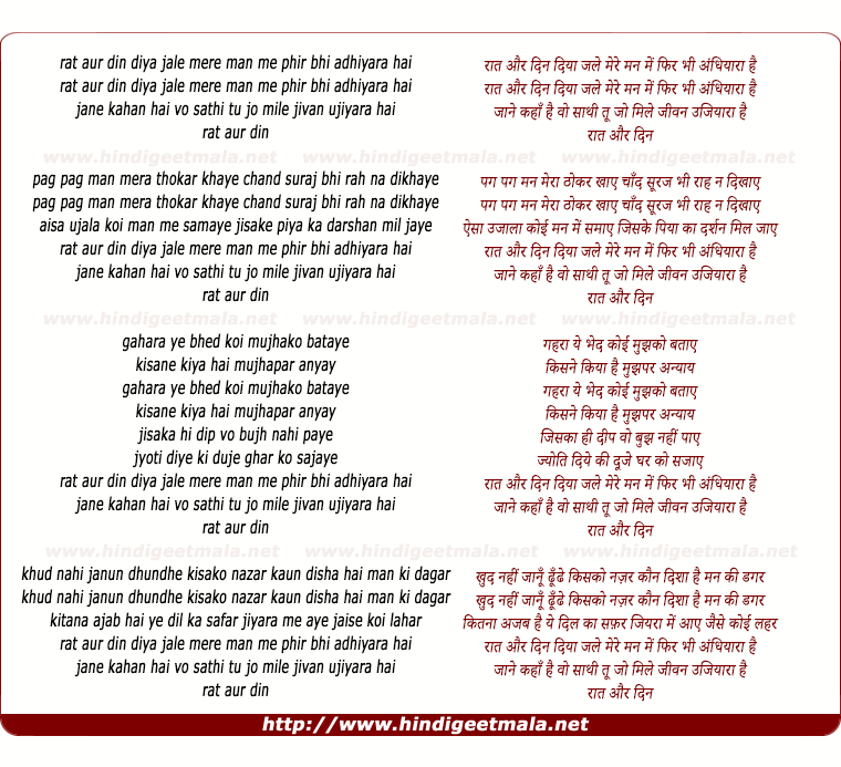 Lyrics of Raat Aur Din Diya Jale, Mere Man Me Phir Bhi Andhiyara Hai (By Mukesh) - रात और दिन दिया जले मेरे मन में फिर भी अंधियारा है