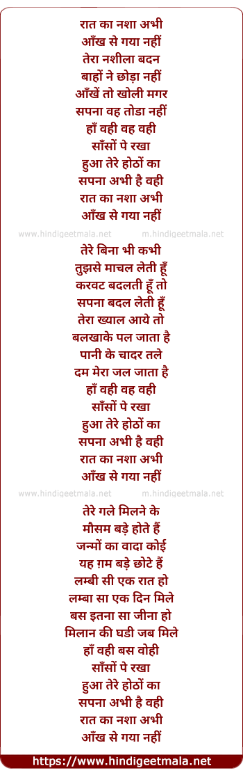 Poetic Translation - Lyrics of Raat Ka Nasha (Duet) - रात का नशा