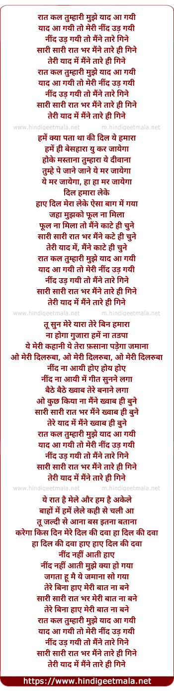 Lyrics of Raat Kal Tumhari Mujhe Yaad Aa Gayi - रात कल तुम्हारी मुझे याद आ गयी