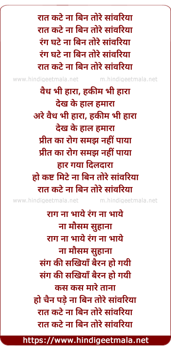 Lyrics of Raat Kate Naa Bin Tore - रात कटे ना बिन तोरे