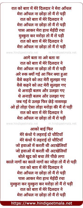 Lyrics of Raat Ko Baag Me Mere Dilbar Ne - रात को बाग़ में मेरे दिलदार ने