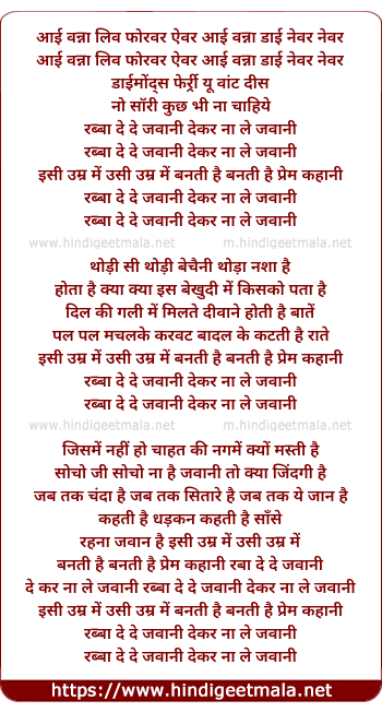 Lyrics of Rabba De De Jawaani - रब्बा दे दे जवानी