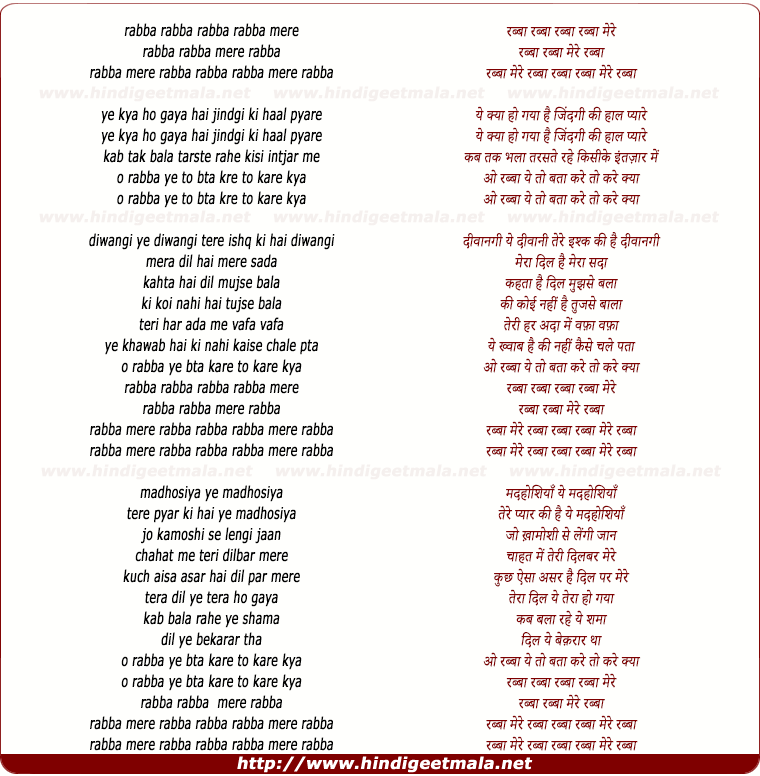 Lyrics of Rabba Rabba Mere Rabba, Yeh Kya Ho Gaya Hai - रब्बा रब्बा मेरे रब्बा, ये क्या हो गया है