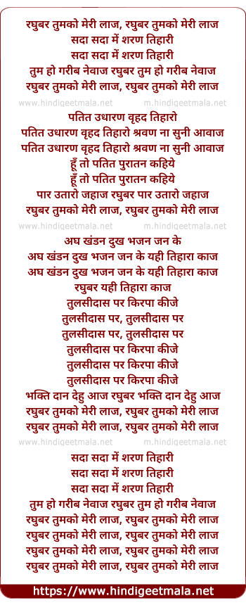 Lyrics of Raghubar Tumko Meri Laaj, Sadaa Sadaa Main Sharan Tihaari - रघुबर तुमको मेरी लाज, सदा सदा मैं शरण तिहारी
