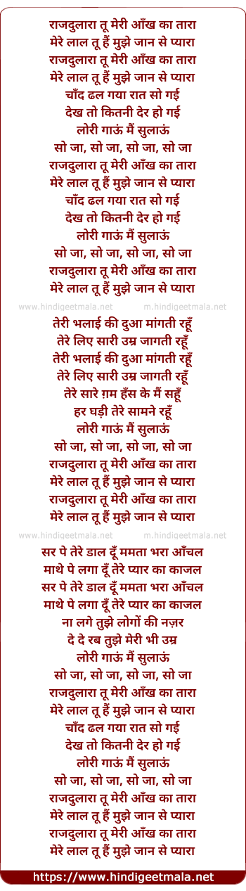 Lyrics of Rajdulara Tu Meri Ankh Ka Tara - राजदुलारा तू मेरी आँख का तारा