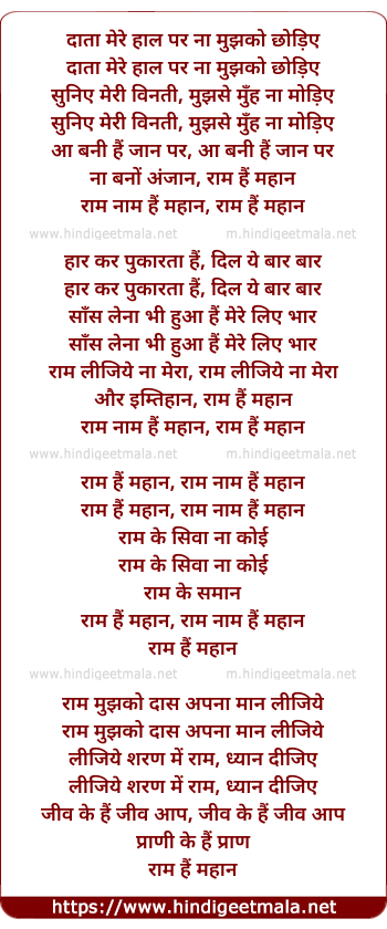 Lyrics of Ram Hai Mahan - I (Female) - दाता मेरे हाल पर ना मुझको छोड़िए