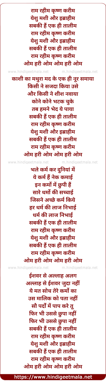 Lyrics of Raam Rahim Karishan Karim - राम रहीम कृष्ण करीम