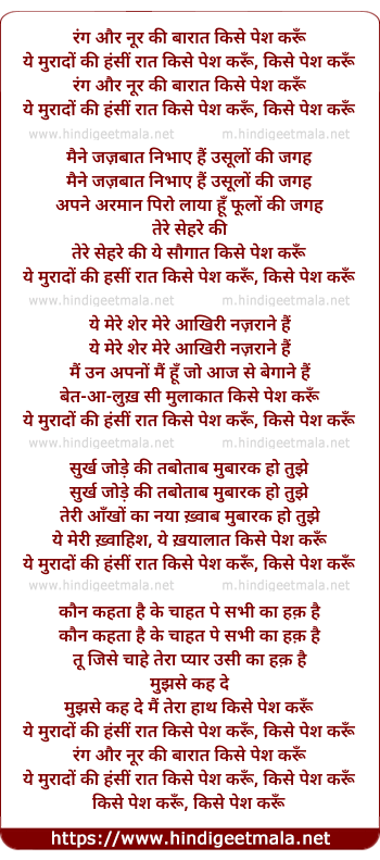 Poetic Translation - Lyrics of Rang Aur Nur Ki Baaraat Kise Pesh Karun - रंग और नूर की बारात किसे पेश करूँ