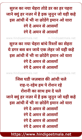 Lyrics of Rang De Aman Se Aasmaan - रंगे दे अमन से आसमाँ