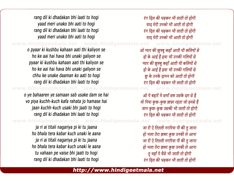 Lyrics of Rang Dil Ki Dhadkan Bhi - रंग दिल की धड़कन भी लाती तो होगी
