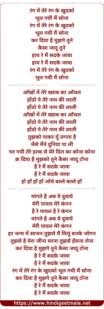 Lyrics of Rang Me Tere Rang Ke Khudko - रंग में तेरे रंग के खुदको