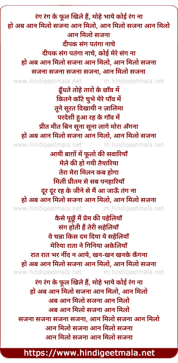 Lyrics of Rang Rang Ke Phool Khile, Mohe Bhaye Koi Rang Na, Aan Milo Sajna, - रंग रंग के फूल खिले हैं, मोहे भाये कोई रंग ना
