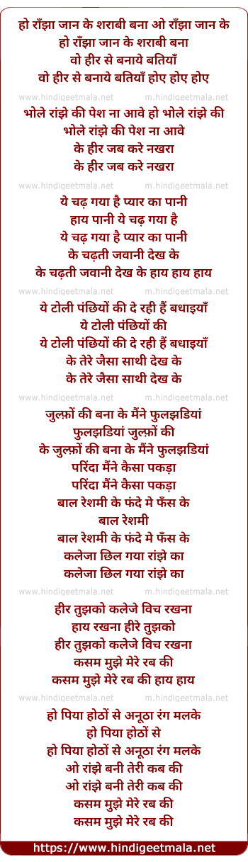 Lyrics of Ranjha Jaan Ke Sharabi Bana - राँझा जान के शराबी बना