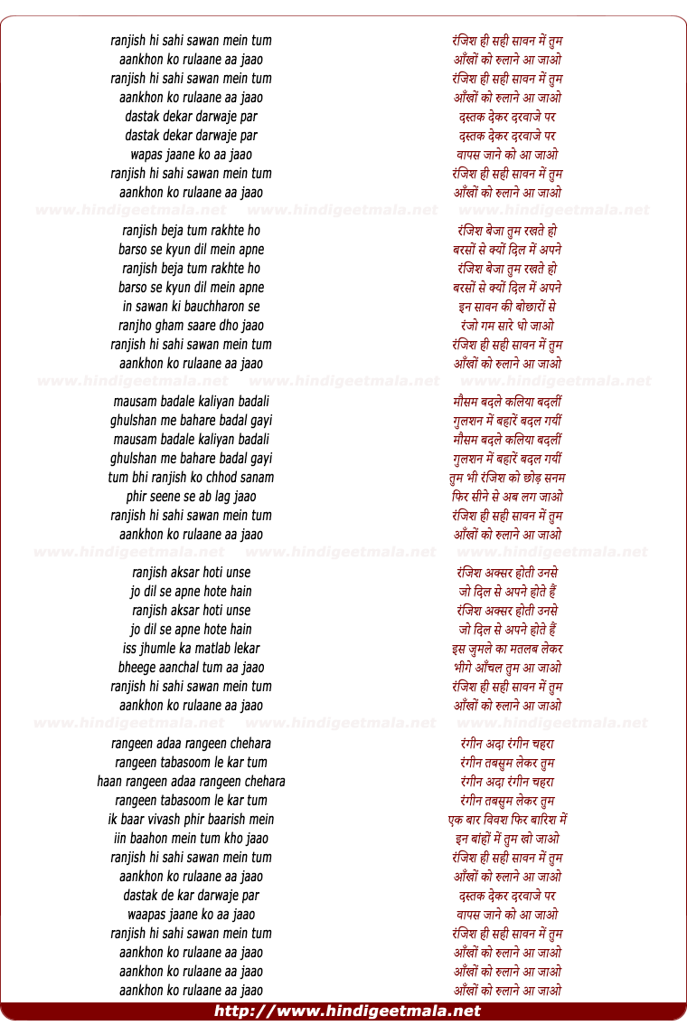 Lyrics of Ranjish Hi Sahi Sawan Me - रंजिश ही सही सावन में तुम