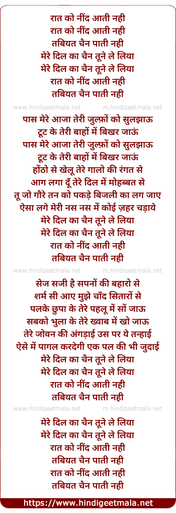 Lyrics of Rat Ko Nind Aati Nahi - रात को नींद आती नही