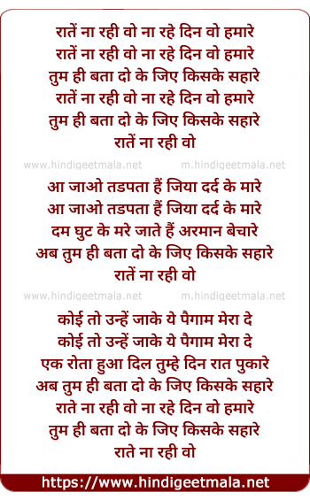 Lyrics of Rate Na Rahi Vo Na Rahe Din - रातें ना रही वो ना रहे दिन वो हमारे