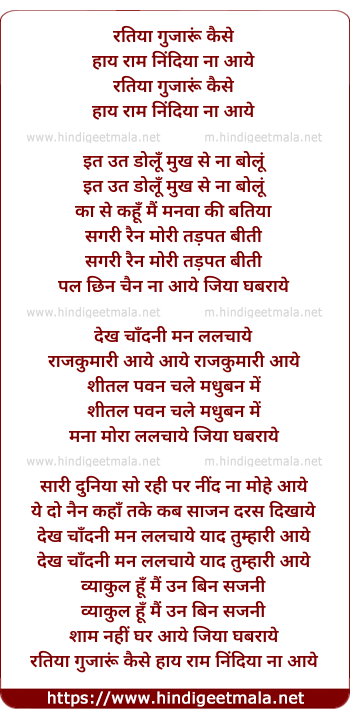 Lyrics of Ratiya Guzaru Kaise Haye Ram Nindiya Na Aaye - रतिया गुजारूं कैसे