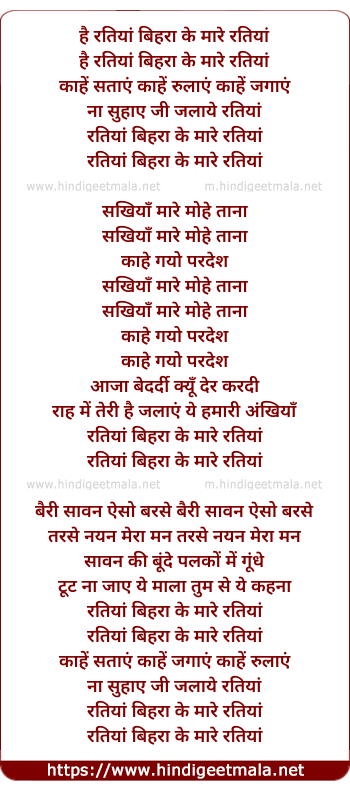 Lyrics of Ratiyaan, Birha Ki Maari Ratiyaan - है रतियां बिहरा के मारे रतियां