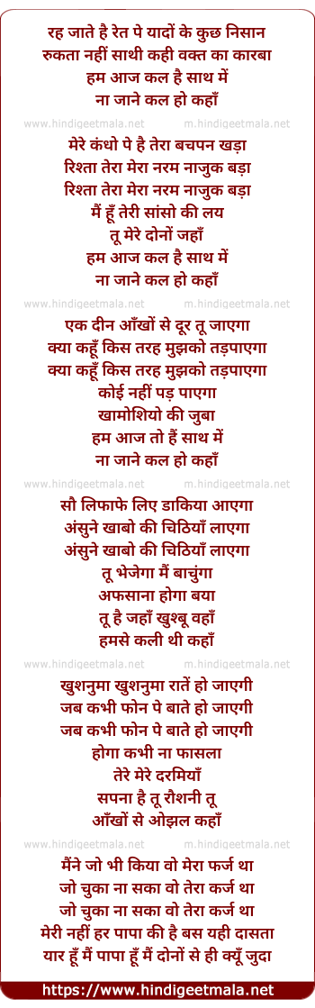 Lyrics of Reh Jate Hai - रह जाते है रेत पे यादों के कुछ निसान