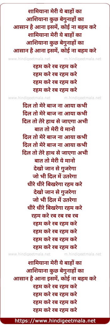 Lyrics of Reham Kare Rab Reham Kare, Shamiyana Meri Ye Baho Kaa - रहम करे रब रहम करे, शामियाना मेरी ये बाहों का