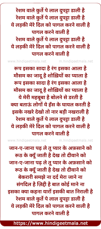 Lyrics of Resham Vaale Kurte Pe Laal Dupattaa Daali Hai - रेशम वाले कुर्ते पे लाल दुपट्टा डाली है