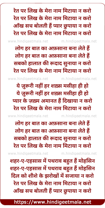 Poetic Translation - Lyrics of Ret Par Likh Ke Meraa Naam Mitaayaa Na Karo - रेत पर लिख के मेरा नाम मिटाया न करो