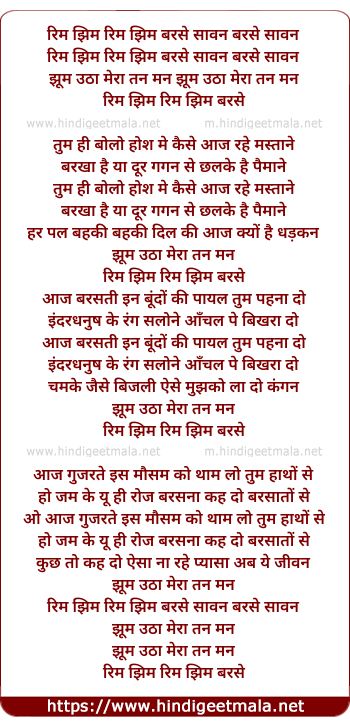 Lyrics of Rim Zim Rim Zim Barse Sawan - रिम झिम रिम झिम बरसे सावन