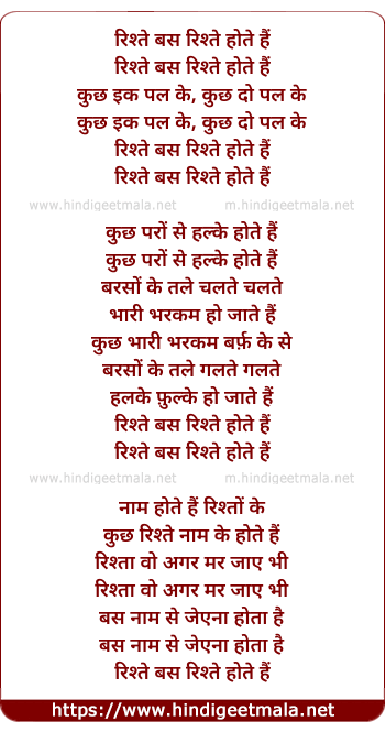 Lyrics of Rishte Bas Rishte Hote Hain - रिश्ते बस रिश्ते होते हैं