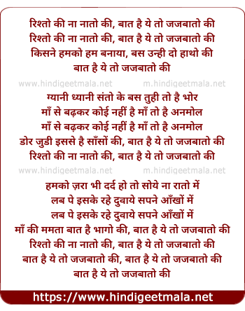 Lyrics of Risto Ki Na Nato Ki (Maa) - रिश्तो की ना नातो की, बात है ये तो जजबातो की