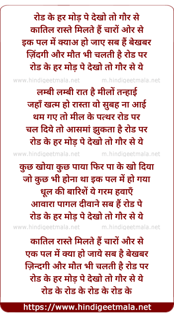 Poetic Translation - Lyrics of Road Ke Har Mod Pe Dekho To Gaur Se - रोड के हर मोड़ पे देखो तो गौर से