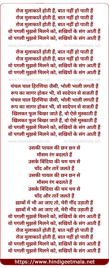 Lyrics of Roj Mulakate Hotee Hain, Bat Nahee Ho Patee Hain - रोज मुलाकातें होती हैं, बात नहीं हो पाती हैं