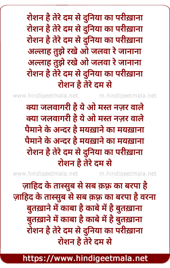 Lyrics of Roshan Hai Tere Dam Se Duniyaa Kaa Parikaanaa - रोशन है तेरे दम से दुनिया का परीख़ाना