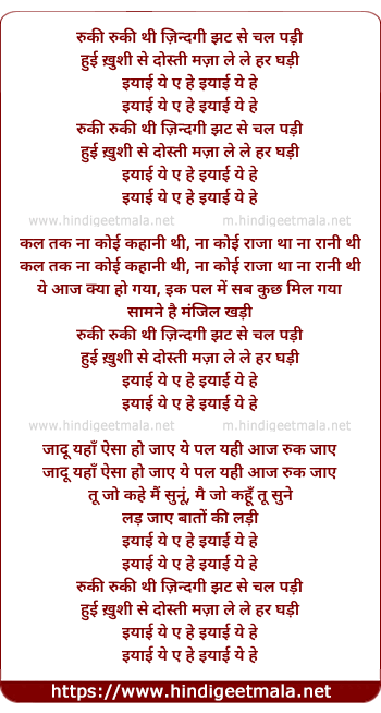 Lyrics of Ruki Ruki Thi Zindagi Jhat Se Chal Padi - रुकी रुकी थी ज़िन्दगी झट से चल पड़ी