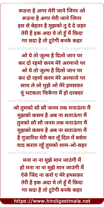Lyrics of Ruthanaa Hai Agar Meri Jane Jigar - रूठना है अगर मेरी जाने जिगर