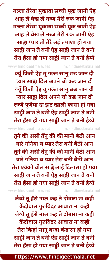 Lyrics of Saadee Jaan Te Banee Eh Haiyye - गल्ला तेरेया मुकाया सच्ची मूक जानी ऐह
