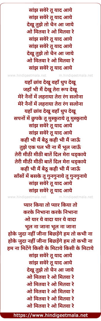 Lyrics of Saanjh Savere Tu Yaad Aaye - सांझ सवेरे तू याद आये