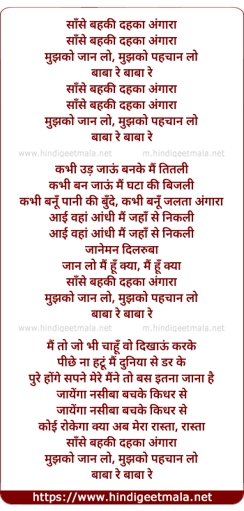 Lyrics of Saansein Behaki Behaka Angaara - साँसे बहकी बहका अंगारा