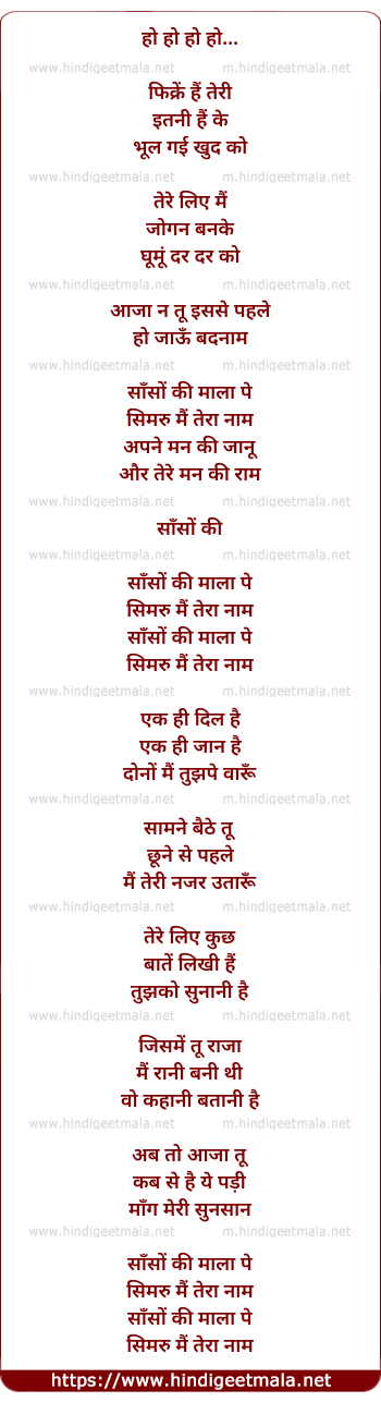 Lyrics of Saanson Ki Mala Pe Simroon Main Tera Naam - साँसों की माला पे सिमरूं मैं तेरा नाम