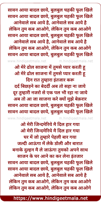 Lyrics of Saawan Aaya Baadal Chhaaye Bulbul Chahki Phul Khile - सावन आया बादल छाये बुलबुल चहकी फूल खिले