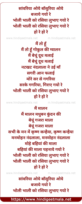 Lyrics of Saawariya Oye Bansuriya Oye - सांवरिया ओये बाँसुरिया ओये