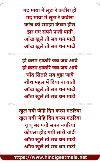 Poetic Translation - Lyrics of Sab Dhan Maati (Duet) - मद माया में लूटा रे कबीरा हो
