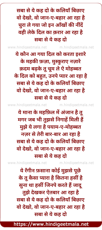 Lyrics of Saba Se Yeh Kah Do - सबा से ये कह दो