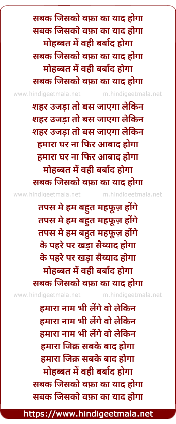 Lyrics of Sabak Jisko Wafa Ka Yaad Hoga - सबक जिसको वफ़ा का याद होगा